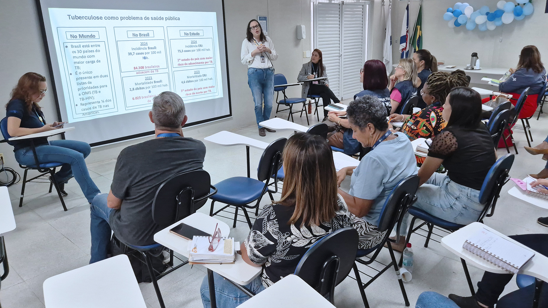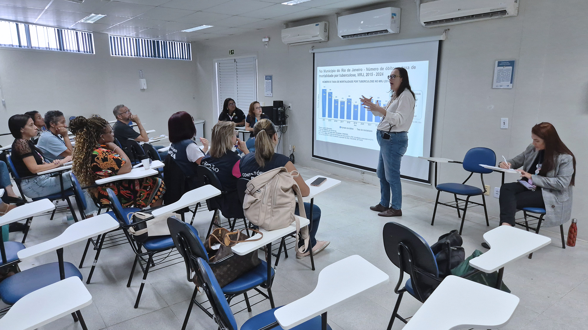 Em seguida, foi apresentado um panorama abrangente sobre a situação da doença em diferentes esferas, trazendo dados do cenário mundial, nacional e estadual, além de informações específicas sobre o município do Rio de Janeiro e, particularmente, sobre a CAP 5.2. Essa contextualização permitiu aos participantes compreenderem os desafios locais e a relevância de ações integradas para o enfrentamento da tuberculose no território.