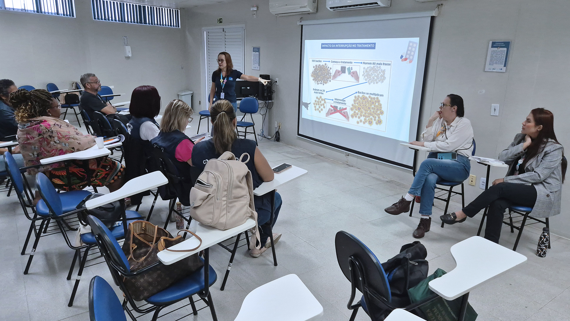 Durante a apresentação, o público foi introduzido aos principais aspectos da tuberculose, incluindo suas formas de transmissão, sintomas e etapas do tratamento. As profissionais destacaram a importância do diagnóstico precoce e da adesão terapêutica, reforçando o papel estratégico dos serviços de saúde na interrupção da cadeia de transmissão. Também foram compartilhadas informações essenciais sobre as medidas de prevenção e os cuidados necessários para o acompanhamento contínuo dos pacientes.
