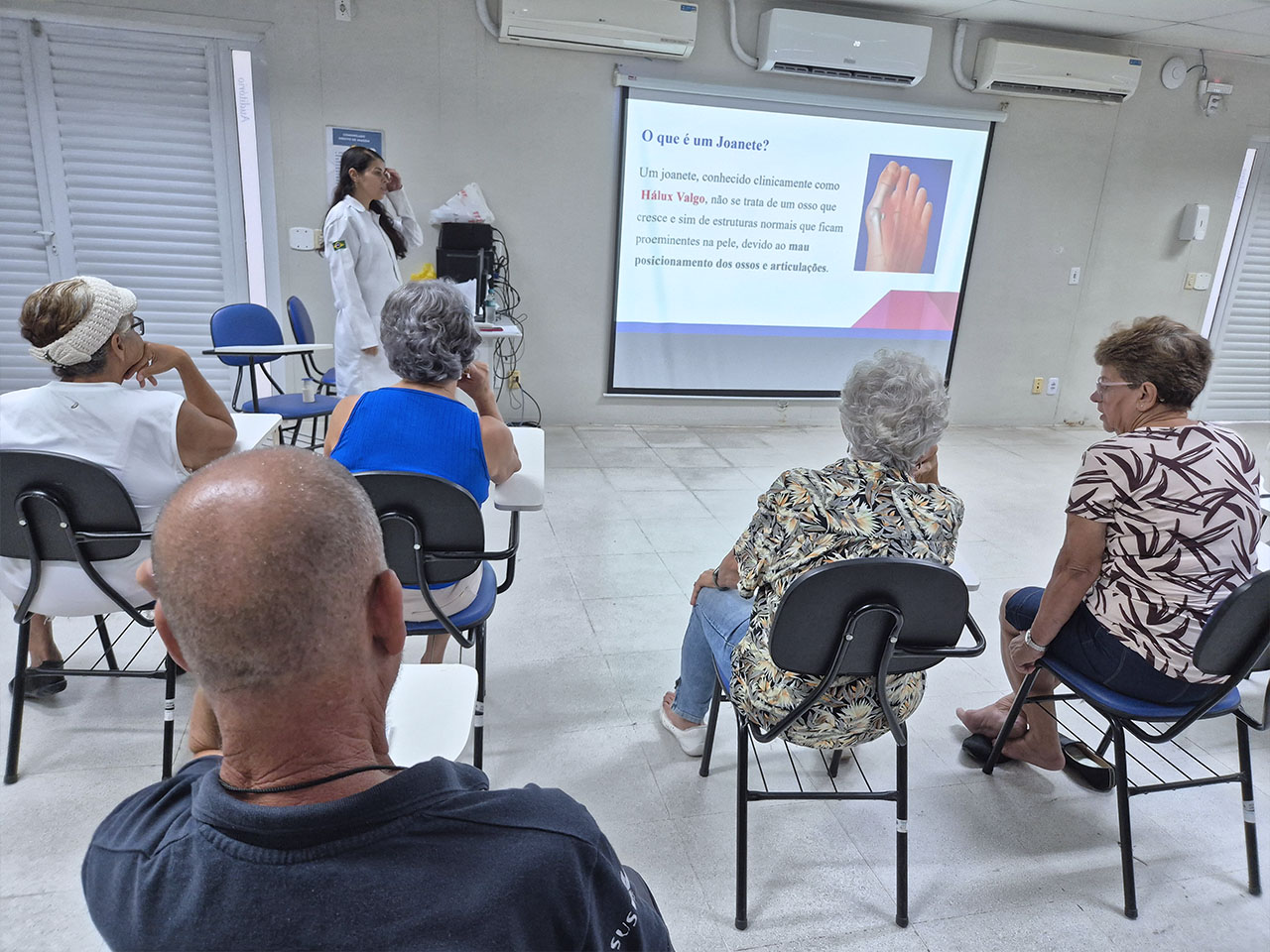 No dia 04 de março de 2026, o auditório da OTICS Campo Grande recebeu uma oficina voltada ao cuidado e ao manejo dos joanetes, condição que pode comprometer a mobilidade e impactar a qualidade de vida. A atividade reuniu usuários acompanhados pela Clínica da Família Medalhista Olímpico Arthur Zanetti, interessados em conhecer estratégias para minimizar desconfortos e melhorar a função dos pés.