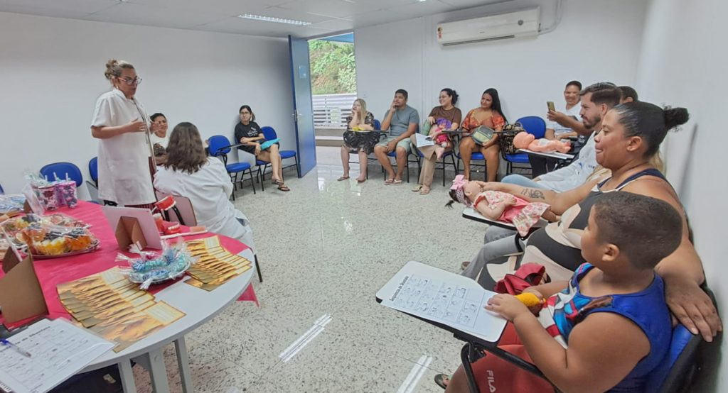 A programação ainda contou com orientações sobre amamentação, oferecendo apoio e informações importantes para as gestantes, além de abordagens sobre saúde bucal da gestante e do bebê. A nutricionista também conduziu orientações sobre alimentação saudável, reforçando a importância de hábitos alimentares adequados durante a gestação e nos primeiros anos de vida, contribuindo para a promoção da saúde e da qualidade de vida das famílias atendidas.